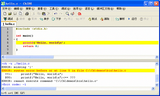 执行“工具|运行”命令处理修改后的程序,结果如下: >ch -u hello.c ERROR: missing ')' ERROR: syntax error before or at line 4 in file hello.c ==>: printf("Hello, world\n"; BUG: printf("Hello, world\n"; <== ??? ERROR: cannot execute command 'hello.c' >Exit code: 1 如图7所示。