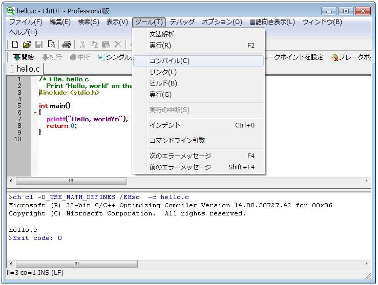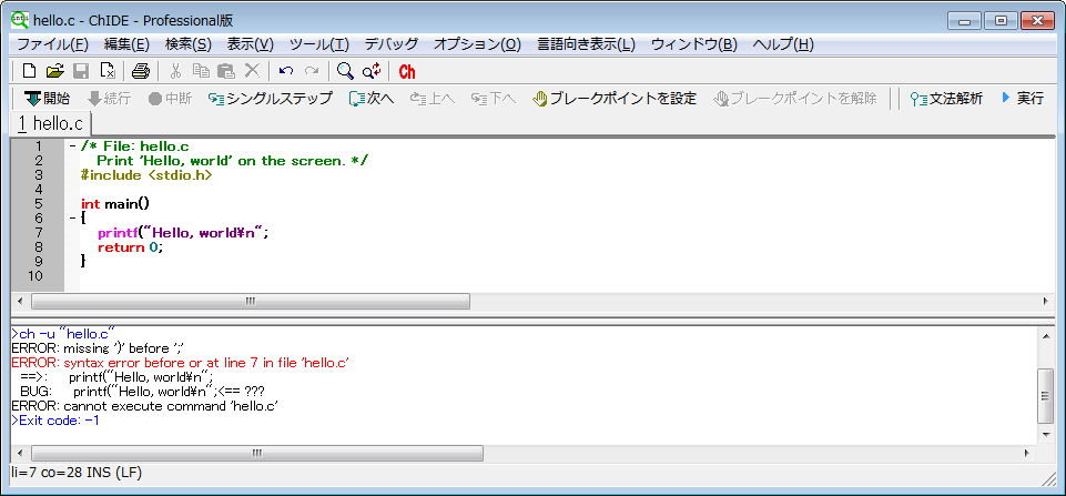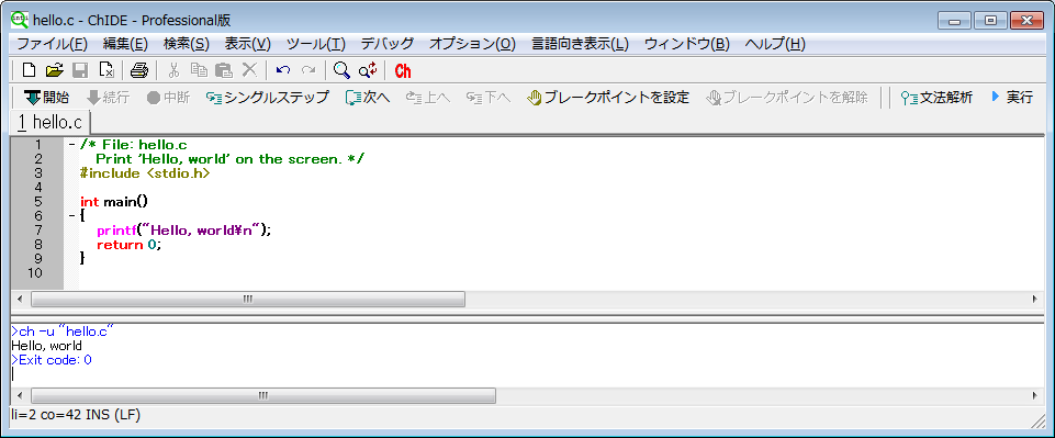 すぐにChインタープリタでデバッグまたは実行可能です。